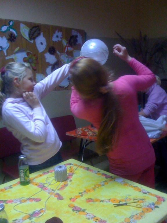 W trakcie zajęć manualnych, odbywających się na świetlicy wiejskiej w Białkowie dzieci wykonywały przy użyciu: balonów, wełny,brokatu i lakieru ażurowe bombki, które zostaną wykorzystane jako kolejny motyw do dekoracji sali w świetlicy wiejskiej na zbliżające się "Andrzejki".