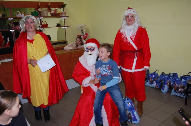 Dzieci przywitały wyjątkowego gościa bardzo uroczyście i serdecznie. Z rumieńcami na twarzach i radością w sercach wywoływały głośno Świętego, który przybył w towarzystwie dwóch śnieżynek. Licznie zgromadzonym dzieciom Święty Mikołaj wręczył osobiście prezenty. Zostały one przyjęte oklaskami. W czasie przerwy można było zjeść kiełbaskę z rożna i napić się herbaty z cytryną. Mikołajkowe harce sprawiły, że z dziecięcych twarzyczek uśmiech wcale nie schodził.Mikołaju, mamy nadzieję, że za rok znów przyjdziesz do wszystkich grzecznych – tych małych i tych dużych!