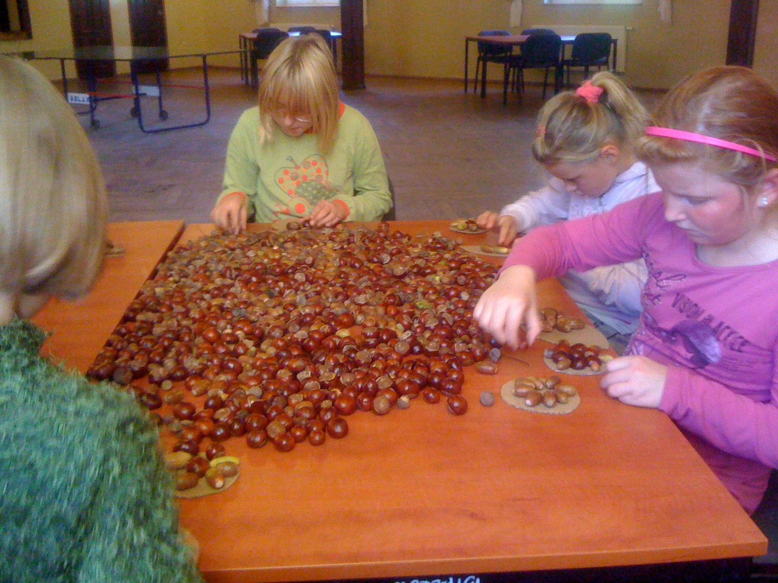 W październiku podczas spacerów po okolicznym parku i lesie dzieci i młodzież nazbierała kasztany i żołędzie , które wykorzystane zostały do wykonania jesiennej dekoracji na świetlicy wiejskie w Białkowie.