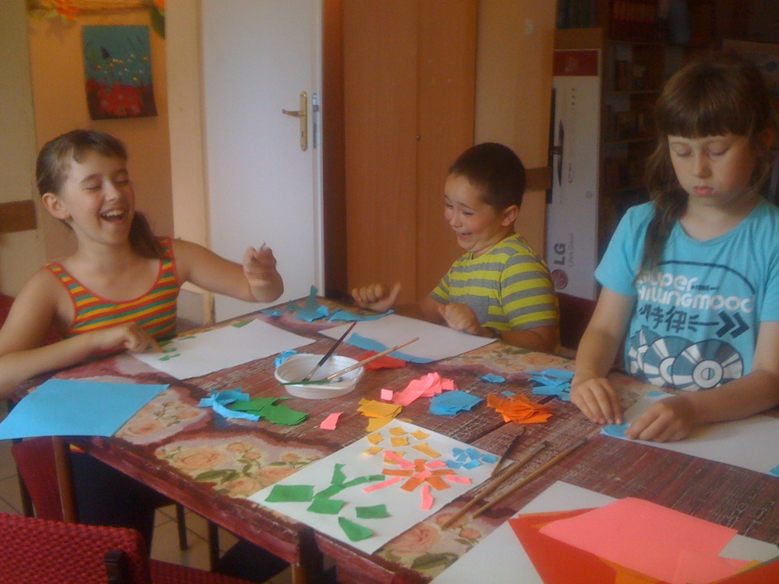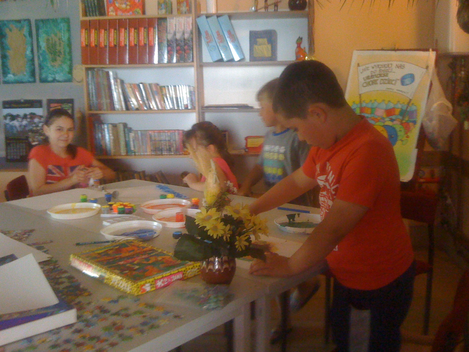 Podczas lipcowych zajęć na świetlicy wiejskiej w Krępicach dzieci wykonywały bibułkowe kwiaty, metodą topowania malowały wakacyjne obrazki.