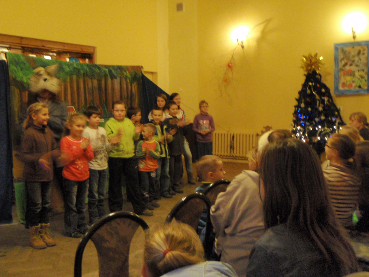 Po przedstawieniu do dzieci przybył oczekiwany Mikołaj z prezentami a następnie wszystkie uczestniczyły we wspólnej zabawie prowadzonej przez instruktora świetlicy z Białkowa panią Beatę Pęcherek.