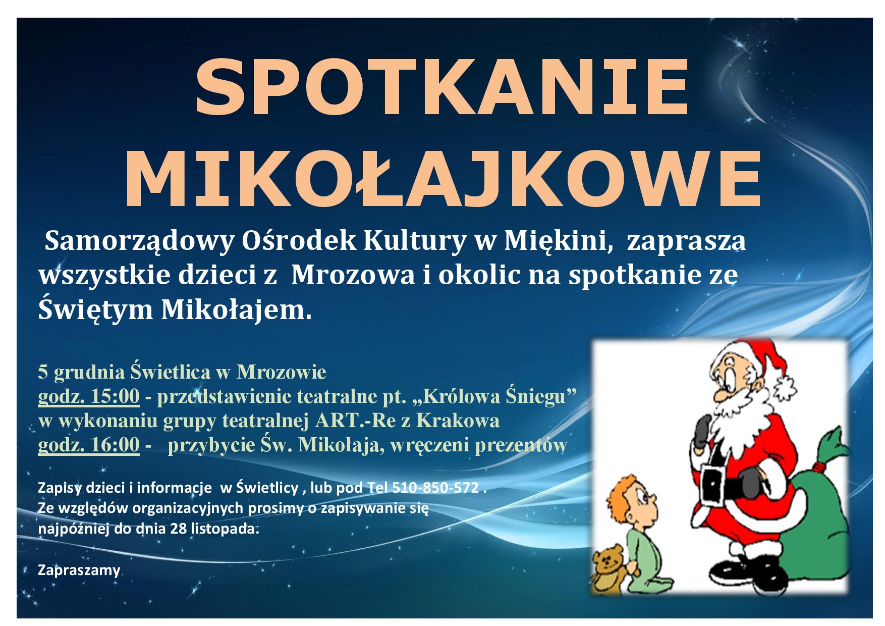 Zapraszamy wszystkie dzieci z Mrozowa i okolic na spotkanie ze Świętym Mikołajem. Informacje i zapisy u instruktora świetlicy Piotra Badziocha.