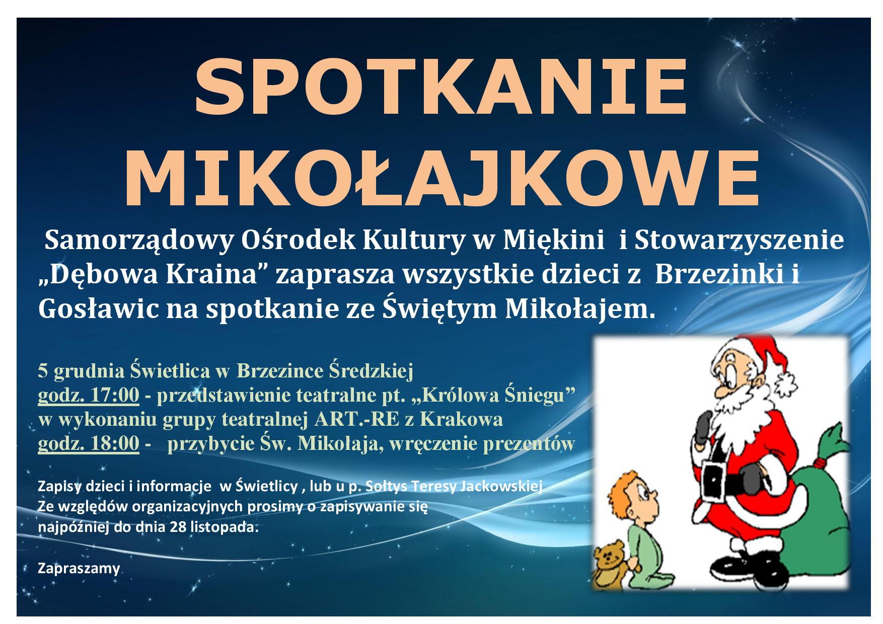 Zapraszamy wszystkie dzieci z Brzezinki Śr. i Gosławic na spotkanie ze Świętym Mikołajem. Informacje i zapisy u instruktor świetlicy Teresy Jackowskiej.