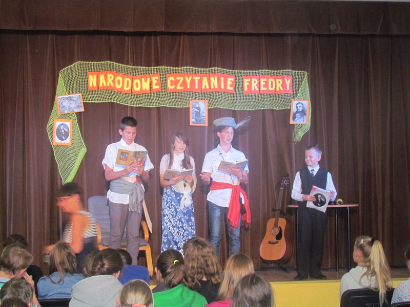 W pierwszej części uczniowie czwartych klas Szkoły Podstawowej w Miękini zaprezentowali bajki Fredry tj. „Paweł i Gaweł”, „Małpa w kąpieli”, „Osiołek”, „Cygan i baba”, Raki w garnku”. Bajki były czytane oraz inscenizowane. Pod koniec spotkania wszyscy uczestnicy mieli za zadanie rozwiązanie krzyżówki na temat wiedzy przedstawionych bajek Fredry.
