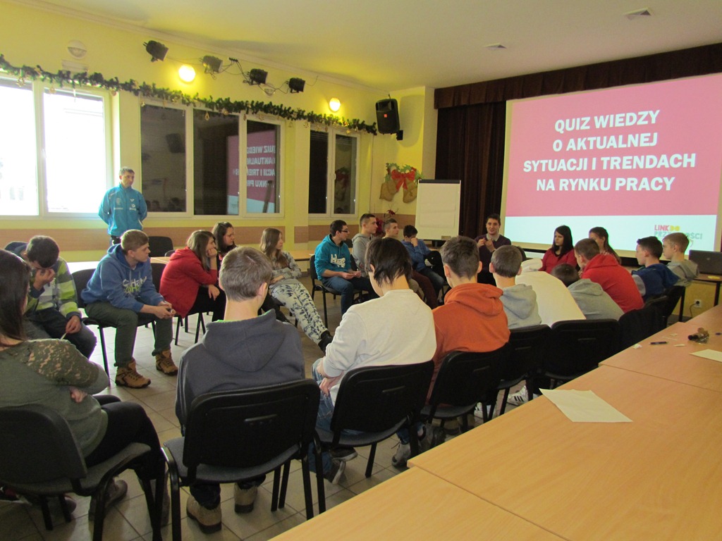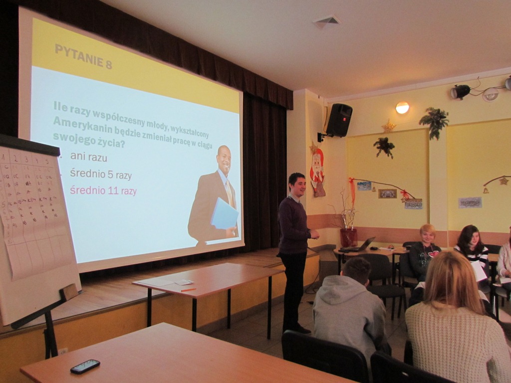 W spotkaniu wzięło udział 54 osoby – uczniowie Publicznego Gimnazjum w Miękini. Dowiedzieli się,jak wygląda dzień pracy młodego profesjonalisty/młodej profesjonalistki, wspólnie rozmawiali o nowych zawodach i zastanawiali się, które z nich są najbardziej przyszłościowe. Całość miała charakter warsztatowy – były quizy, pytania, wspólne ćwiczenia.