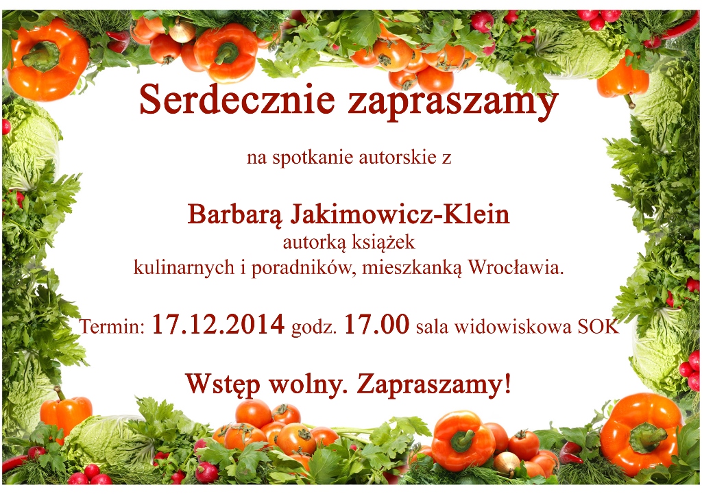 Serdecznie zapraszamy na spotkanie autorskie z Barbarą Jakimowicz-Klein - autorką książek kulinarnych i poradników, które odbędzie się w dniu 17 grudnia (środa) br. o godzinie 17.00 w sali widowiskowej SOK.
