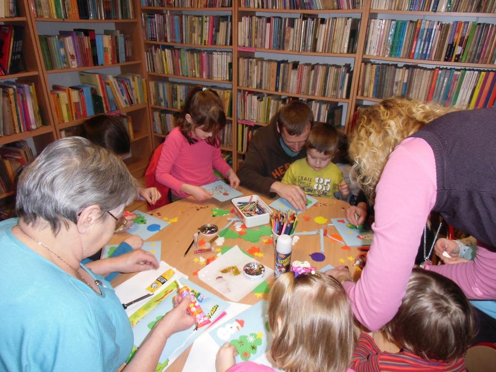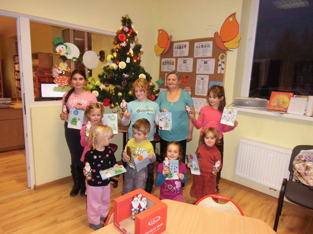 Uczestnicy słuchali opowieści wigilijnych oraz kolęd świątecznych śpiewanych przez dzieci. Po słuchaniu Pani Emilia uczyła dzieci jak zrobić piękną kartkę świąteczną. Na końcu spotkania dzieci ubierały chonkę, która zdobi dział dziecięcy biblioteki. Każdy uczestnik otrzymał czekoladowego mikołaja i własnoręcznie robioną kartkę świąteczną. Serdecznie zapraszamy na kolejne "Czytanie dzieciom", które odbędzie się 09.01.2014r. w Bibliotece w Miękini. Tematyką spotkania będzie Karnawał.