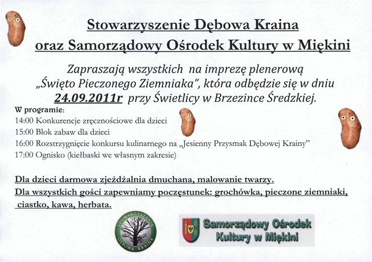 Stowarzyszenie Dębowa Kraina oraz Samorządowy Ośrodek Kultury w Miękini zapraszają wszystkich na imprezę plenerową „Święto Pieczonego Ziemniaka", która odbędzie się w dniu 24.09.2011r przy świetlicy w Brzezince Średzkiej.