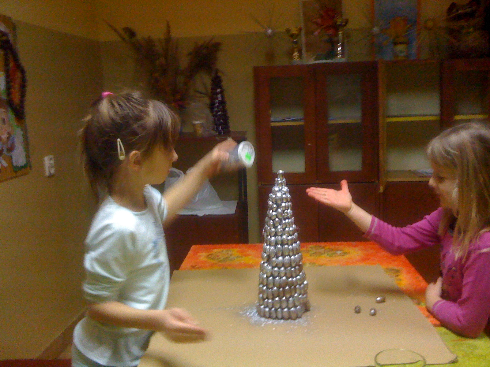 Podczas jesiennych spacerów dzieci zbierały żołędzie i kasztany, które podczas zajęć zostały wykorzystane do wykonania srebrnych i złotych choinek.