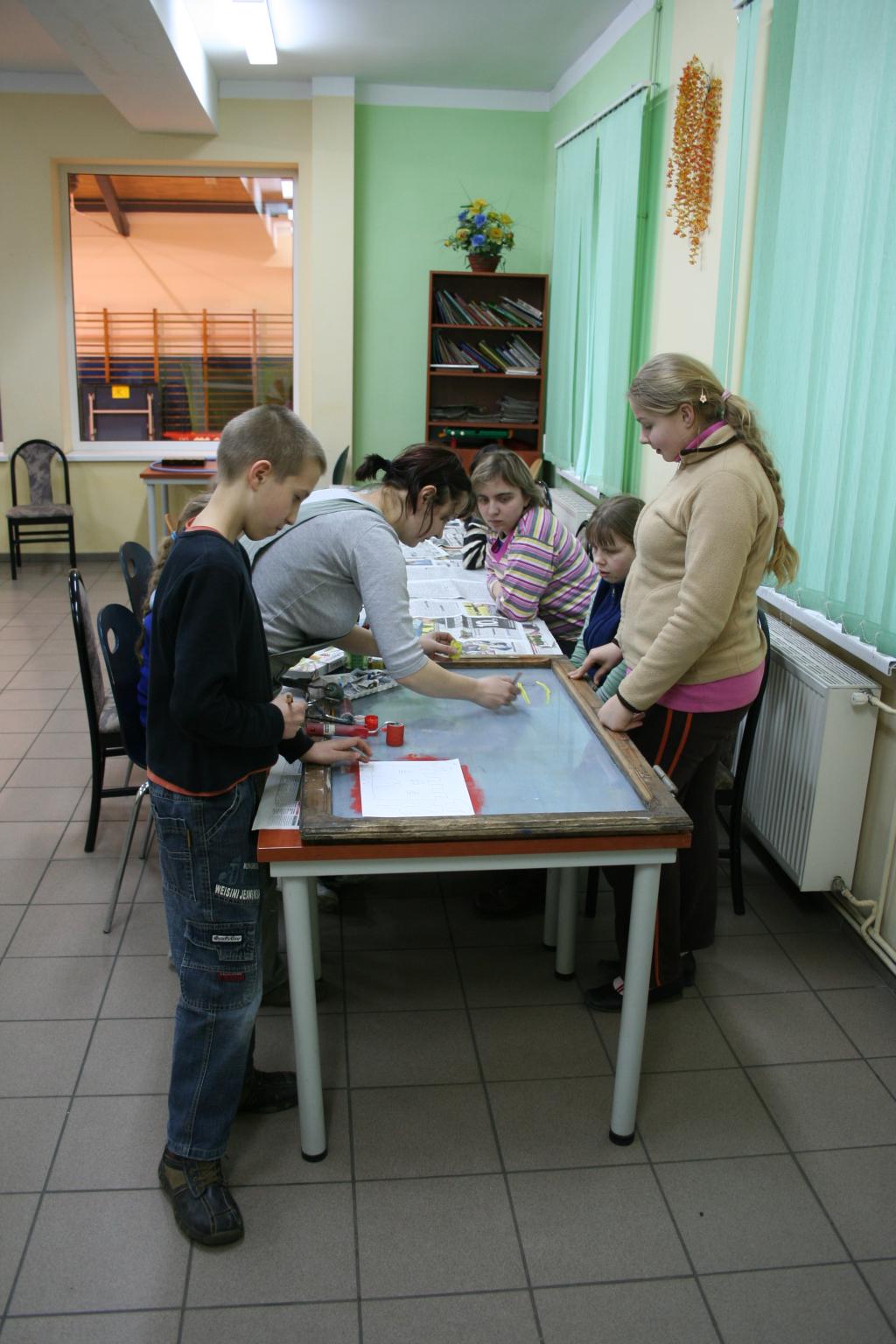 Na jednych z ostatnich spotkań dzieci i młodzież poznały monotypie. Uczestnicy nakładali farbę na tafli szkła, rozprowadzali ją wałkiem a następnie przykładali do niej kartki czystego papieru i przy pomocy ołówka nanosili wzór na rysunek. Po odwróceniu kartki młodzi artyści mogli obejrzeć swoje dzieło.