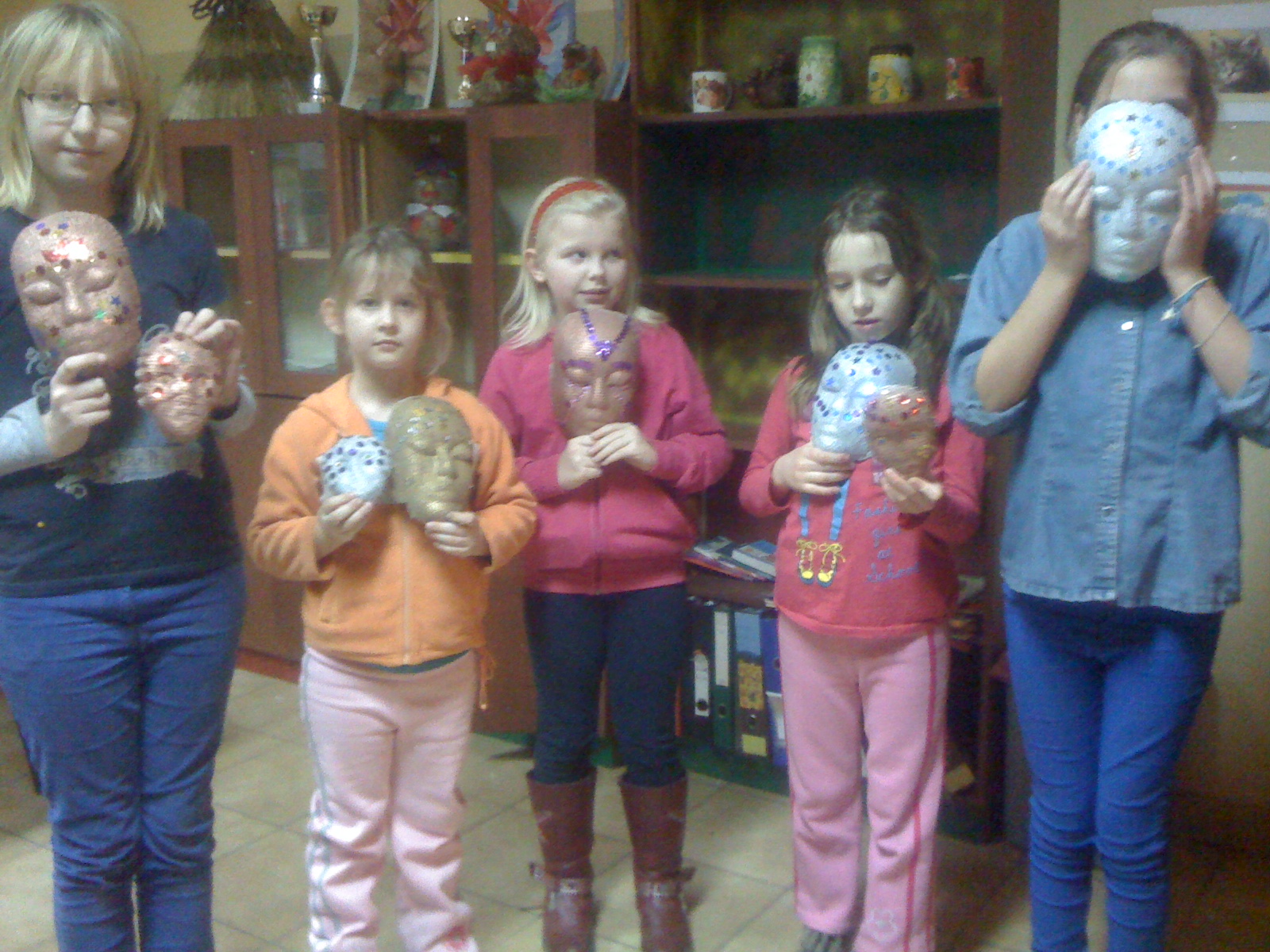 Podczas zajęć manualnych na świetlicy wiejskiej w Białkowie dzieci przez kilka dni wykonywały z papieru czerpanego maski karnawałowe. Po wyschnięciu maski były malowane o następnie ozdabiane kolorowymi cekinami.