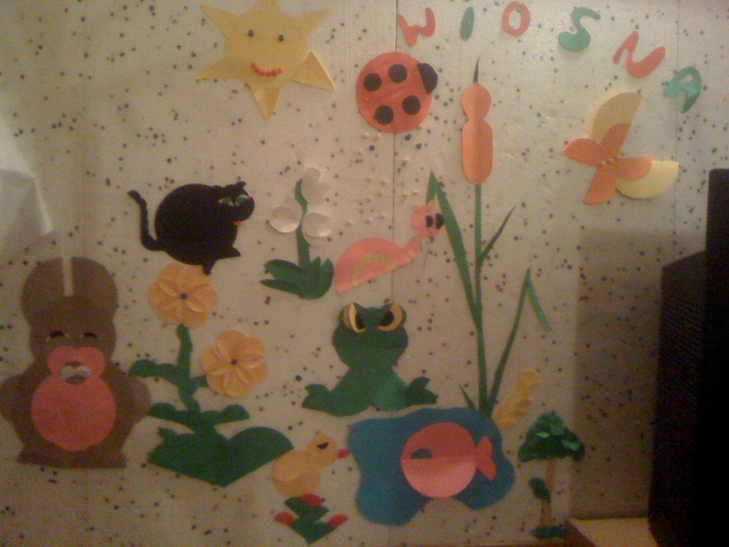 Oprócz tego podczas zajęć plastycznych na dzieci wykonały wiosenną tablicę na której znalazły się: kwiatki, żabka, kotek, rybka, zajączek, biedronka, motylek, ślimak oraz kurczaczek wszystkie postacie wykonane zostały z kółkowego origami.