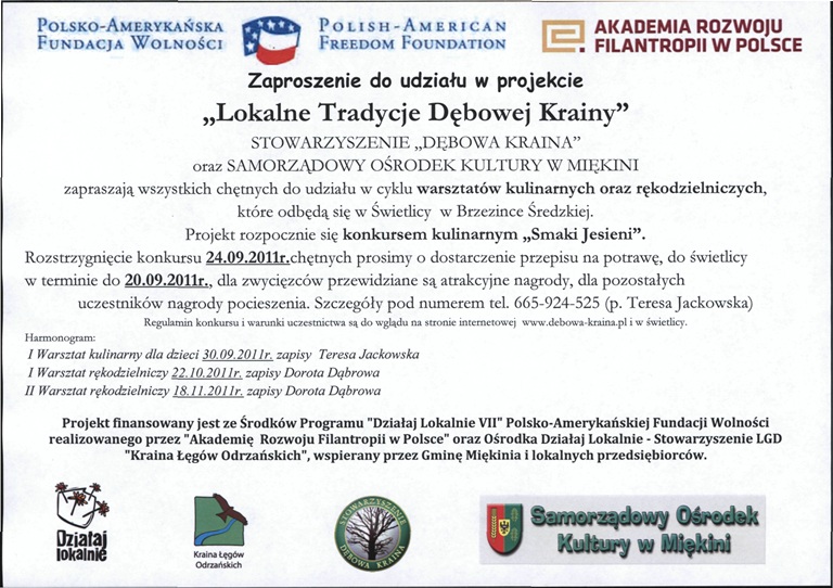 Stowarzyszenie „Dębowa Kraina" oraz Samorządowy Ośrodek Kultury w Miękini zapraszają wszystkich chętnych do udziału w cyklu warsztatów kulinarnych oraz rękodzielniczych, które odbędą się w Świetlicy w Brzezince Średzkiej. Projekt rozpocznie się konkursem kulinarnym „Smaki Jesieni".
