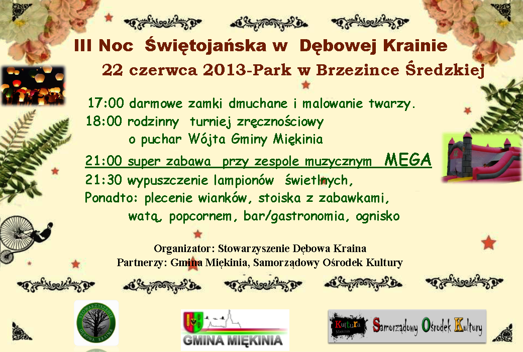 W dniach 17 – 18 sierpnia w Miękini odbędzie się Festiwal Lata. Zapraszamy wszystkich do udziału w organizowanych przez wójta Gminy Miękinia konkursach dożynkowych: na najpiękniejszy wieniec oraz najciekawsze stoisko wiejskie.