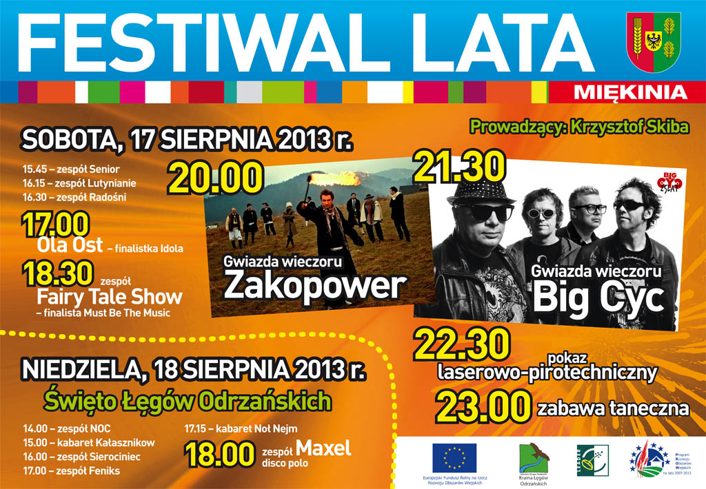 2.Regulamin jest wydany przez organizatora imprezy Gminę Miękinia - Samorządowy Ośrodek Kultury, z siedzibą w: 55-330 Miękinia, ul. Kościuszki 43, zwanego dalej „Organizatorem” „Festiwalu Lata w Miękini” zwanego dalej „Imprezą” w dniu 17.08.2013 r. od godziny 14:00 do godz. 02:00 w dniu 18.08.2013. Na boisku sportowym w Miękini ul. Sportowa.